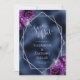 Este elegante casamento moderno, exceto o cartão de data, apresenta uma imagem geométrica prateada decorada com buquês florais roxas e prateadas num fundo azul marinho. O texto personalizável combina a escrita manual imétrica de cinzas prateadas, a placa de cobre e as fontes itálicas. O verso repete a imagem da folha azul.