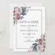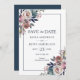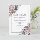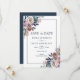 Um lindo casamento floral com aquarela, salve a data. As cores das flores são cor-de-rosa-claro, azul-poeirento escuro profundo, roxo rosa poeirento com folhas. Perfeito para qualquer tema, tempo ou ano, neutro. A parte traseira da carta tem nomes de noiva e noivo