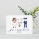 Ouro elegante e design náutico azul-marinho com faixas azuis marinho, forma semitransparente para informação com uma falso estrutura dourada, uma âncora falsa de folha de ouro. Para este: dois marinheiros bonitos, dois corações e tipografia de letra "salve a data". Use a ferramenta Personalizar para adicionar suas informações. Para itens correspondentes, visite minha Marinho Stripes Dourada Coleção Náutica.