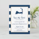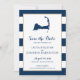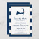 Anúncio de casamento para o seu casamento em Cape Cod. Mapa azul marinho de Cabo Cod com coração vermelho sobre Orleans, Massachusetts. CORES em Marinho Blue Stripes com Dourado caimento. Para obter informações sobre alterações de design personalizadas pelo designer independente, envie um email para paula@labellarue.com ANTES de personalizar ou fazer um pedido.