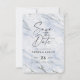 Mármore Azul-Claro-Chic com Cartões salve a data de Leve Prateada. Esta design de casamento moderna é bela feita com sutis cores sutis que são perfeitas para qualquer estação. Mostrada na pintura da Paleta de Cores do Casamento Eucalyptus na Colorway Off Blue & Silver - Com veias de folhas brilhantes falsas e detalhes dourados, e uma bela fonte de script de assinatura com caudas, a coleção de casamento de Marbles Metálicos certamente fará seu casamento memorável e bonito! Para ver mais, procure as coleções de casamento de 2021 da Chic Paperie para ver mais designs de tendências e cores de casamento para este ano.