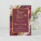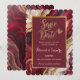 Crie uma primeira impressão duradoura com este elegante cartão de Save the Date burgundy e dourado. Com um fundo de mármore ágata luxuoso e uma moldura dourada refinada, este design moderno exala sofisticação e charme. Perfeito para casamentos contemporâneos, combina perfeitamente a elegância atemporal com um toque de glamour. Anuncie seu dia especial com estilo e defina o tom para uma celebração inesquecível!