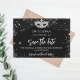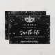 Um cartão de datilografia e moda Salve a data para uma festa de aniversário de 50 anos (ou qualquer idade). Um fundo preto clássico decorado com faíscas prateadas falsas e uma máscara de mascarada. Personalize e adicione uma data e nome/idade. O texto: Salvar a Data é gravado com um script de estilo com letra de tendência grande.