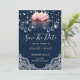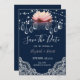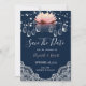 Mason jar, rendas, lótus e linhas de luz sobre fundo azul marinho. Salve a data que pode ser personalizada com seu nome. Selecione o botão "personalizar" para alterar o estilo, a cor e o tamanho da fonte.