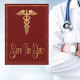 O estilo dourado falso com fundo preto cria uma graduação moderna clássica, salve o cartão de data. Perfeito para formandos terminarem seus estudos na faculdade de medicina, ganharem o grau de enfermagem, cerimônia de finalização e profissionais da indústria médica. Enfermagem ou graduação em doutor, salvar a data inclui um símbolo faux gold caduceus junto com um boné de formatura. Envie um cartão de data para sua família e amigos. A cor vermelha de fundo pode ser alterada para a cor de sua escolha.