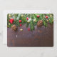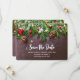 Salve o cartão de data com uma fotografia rústica de uma mesa marrom de madeira com pinecones, agulhas de pinheiros, neve e Enfeites de natal. Festivo e adorável.