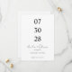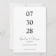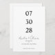 This minimalist save the date card features a clean and modern layout with strong visual balance. The wedding date is displayed in a bold vertical format, making it the main focus of the design. Simple black typography on a white background creates a timeless and elegant look. The couple’s names are written in soft script lettering, adding a romantic contrast to the structured date layout.