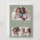 Essa simples e minimalista placa Save the Date apresenta uma colagem de 3 fotos, com uma foto em forma de arco na parte superior e duas fotos quadradas menores na parte inferior. No meio, as palavras "Salvar a Data" aparecem no elegante guião branco, seguido dos nomes dos casais, da data do casamento e da cidade em sans serif, em um fundo verde sábio. Adicione uma mensagem mais detalhada com informações adicionais sobre o contrário.