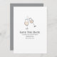 Uma placa plana minimalista, simples e simples "salve a data" tem uma ilustração desenhada à mão de dois copos de champanhe inclinados um para o outro em pêssego pastel coberto de cinzas derradeiras. Eles são colocados sobre um fundo branco e têm modelos para sua redação personalizada em cinzas abaixo deles. O fundo final da cinza no verso tem uma modelo para obter informações adicionais, se necessário. Estes são ideais para anúncios de hetero e lgbqt.
