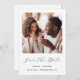 Este simples e minimalista Cartão Salvar a Data contém uma foto quadrada acima das palavras "Salvar a Data" no elegante roteiro preto de manuscrito, seguido pelos nomes do casal, data do casamento e cidade em sans serif em um fundo branco. Adicione uma mensagem mais detalhada com informações adicionais no verso, juntamente com um código QR que envia convidados para o seu site de casamento.