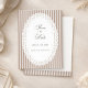 Elegant wedding invitation featuring classic mocha beige French pinstripes and a delicate scalloped lace doily-inspired frame for a romantic vintage look. The soft neutral ivory and mocha palette creates a timeless, refined aesthetic that pairs beautifully with farmhouse weddings, classic romantic celebrations, and modern vintage wedding themes. Clean, sophisticated, and effortlessly chic, this design is perfect for couples who love neutral wedding stationery with a touch of lace elegance.