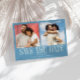 Simple and modern wedding save our date card featuring a text that says "SAVE THE DATE." 2 photos on the front and one on the back. The background is denim blue.