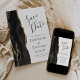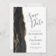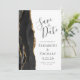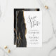 A borda esquerda deste elegante casamento moderno salve o cartão de data apresenta uma borda de agata preta aparada com falso brilho dourado. O texto personalizável combina a escrita manual de cinzas de carvão, as fontes em copperplate e itálico em um fundo branco. O verso apresenta um design de agate preto e dourado correspondente.
