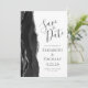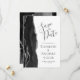 A borda esquerda deste elegante casamento moderno salve o cartão de data apresenta uma coloração d'água preta aparada com falso brilho prateado. O texto personalizável combina a escrita manual de cinzas de carvão, as fontes em copperplate e itálico em um fundo branco. O verso apresenta um design de agata preto e prateado correspondente.