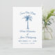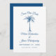Peça aos seus hóspedes para salvar a data do seu casamento com este design simples e elegante, que contém um roteiro moderno, texto azul e uma palmeira artística. Personalize-o com sua data de casamento, nomes e localização.