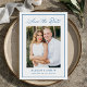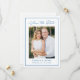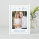 Announce your wedding with this modern photo wedding save the date featuring “Save the Date” in blue calligraphy script at the top and a coordinating blue border framing the design. Your vertical photo is displayed at the center, with your names, wedding date, and location shown below in clean, easy-to-read lettering. This modern wedding save the date is perfect for coastal weddings, beach weddings, summer weddings, and destination weddings. The back is blank, allowing space for a wedding website and additional photos.