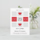 Modern checkerboard wedding save the date design in red and gray on a white background with striking hearts and an outstanding and striking date design.