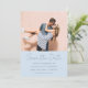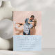 This photo save the date puts your favorite couple photo front and center, with names, wedding date, location, and website displayed below in a soft blue color combination that feels bold, modern, and completely celebratory.