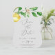Este casamento de cinzas de limão moderno, exceto o cartão de anúncio de data é perfeito para um casamento de primavera ou verão. O design mediterrânico rústico apresenta limões aquosos brilhantes e bonitos com flores brancas boêmicas e folhas verdes elegantes.