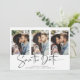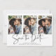 Moderno manuscrito Salve a data Cartão com fotos múltiplo em uma fonte elegante e evoca um toque romântico manuscrito. Projetado para usar três de suas fotos favoritas para personalização adicional. Adicione facilmente seus nomes e datas para um design verdadeiramente personalizado.