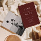 This wedding save the date card features a minimalist and modern style. The front has a clean Burgundy background with classic White typography, combining bold serif fonts with a touch of script for a refined look. The back showcases a black-and-white photo of the couple with text overlay, creating a romantic and timeless design.