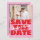 This bold modern save the date features oversized red block lettering, a playful handwritten name overlay, and a bright pink backdrop that sets a fun, joyful tone. The full-photo layout adds warmth while the graphic typography gives the announcement a trendy, upbeat feel. Perfect for couples planning a lively, modern celebration and wanting a save the date that stands out. This product brings color, personality, and energy to your wedding stationery.