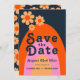 Arca retrógrada moderna do arco-íris e casamento simples da margarida 60, estilo 70, salvam o convite de data. Um tema de cor hippy com ranhura vintage, com cor azul marinho, cor-de-laranja cor-de-laranja cor-de-laranja cor-de-laranja-cor-de-tangerina-amarelo. Linda margarida minimalista no verso do convite e três margaridas simplistas com uma tipografia de estilo arca e groovy 70. Arte original da artista Catherine Sweetman