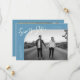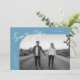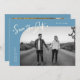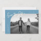 Modern and stylish save the date card featuring a hand lettered script text that says "save the date." One photo in the font and one on the back. The background is denim blue.