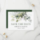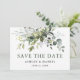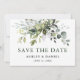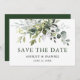 Anúncio de Noivado de Casamento com Molerce Botânico Moderno Elegante Aquarela Salva o Cartão de Data inclui folhas de eucalipto, folhagem botânica verde, folhas azuis empoeiradas e outras lindas culturas botânicas. Texto verde.