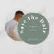 O círculo de tipografia clássico moderno salva o cartão de data com texto mínimo na frente em um fundo verde sábio e sua imagem de escolha no verso. Personalize esta rodada guarde o cartão de data com a sua própria fotografia, nomes, data do casamento e localização. As cores também são personalizáveis.