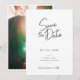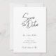 Um simples e elegante cartão moderno de save-the-date de casamento em preto e branco. Apresenta uma fonte de texto manuscrito para os nomes, combinada com texto moderno e limpo. Personalize o texto, nomes, fotos e cores de fundo para combinar com o tema exclusivo do seu casamento. Este save-the-date é adequado para cerimônias e recepções de casamento modernas, atuais ou informais. Complete a papelaria do seu casamento com o resto da nossa Coleção de Casamento de Script Minimalista Moderna.