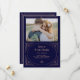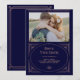 Esses elegantes cartões de aviso de casamento apresentam uma interpretação moderna do clássico art déco. Uma moldura geométrica ornamentada com aparência de dourado rosa falso e ornamentação decoram um fundo azul marinho escuro e elegante com a sua foto pessoal favorita para um visual dramático e vintage de casamento.