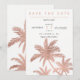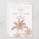 Moderno salvar a data simples de palmeiras em ouro rosa falso com tipografia simples, um tema de casamento trendy e tropical em palmeira.