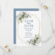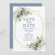 Verde Botânico Elegante moderno Salve a Data O Cartão inclui folhas de eucalipto, folhagem botânica verde, folhas azuis empoeiradas e outro belo verde botânico. Dourado quadro geométrico.