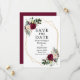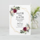Moderno Elegante Watercolor Burgundy Noivado Floral Anúncio de Casamento Salvar O Cartão de Data inclui peões, lírios, folhas de eucalipto e outro belo verde numa armação geométrica de ouro.