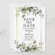 Verde Botânico Elegante moderno Salve a Data O Cartão inclui folhas de eucalipto, folhagem botânica verde, folhas azuis empoeiradas e outro belo verde botânico. Dourado quadro.