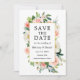 Anúncio de Noivado Floral de Casamento Floral Elegante, Cor de Água Rosa, Cor Rosa, Salva A Ficha de Datas inclui lindas rosas rosa, flores brancas e verde botânico. Dourado quadro.