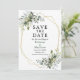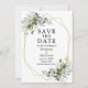 Verde Botânico Elegante moderno Salve a Data O Cartão inclui folhas de eucalipto, folhagem botânica verde, folhas azuis empoeiradas e outro belo verde botânico. Dourado quadro geométrico.