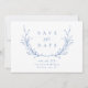 A eruta e eruta crista de folhas botânicas ilustrada com moderna escrita de tendências e fonte clássica em azul e branco, Simples e sofisticado. cartões salve a data excelentes para casamento clássico moderno, casamento formal simples, casamento elegante de jardim botânico. Ver todas as peças correspondentes na coleção