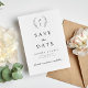 Um casamento formal e minimalista, mas simples e elegante, salva a data com a crista monográfica do nome da noiva e do noivo e uma combinação de sans serif e letra de caligrafia guiada.