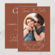 Celebre a história do seu amor com estilo com o nosso Save the Date de Monograma de Foto em Terracota com Letra Moderna. Com um fundo terracota quente, letra cursiva elegante e um monograma personalizado, este design combina minimalismo contemporâneo com charme romântico. Mostre sua foto favorita em um layout limpo e moderno que destaca seus nomes, data do casamento e a alegria que compartilham enquanto se preparam para dizer “Eu aceito.”