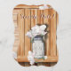 Monograma Rustic Mason Jar and Pink Peonies sentados numa prateleira de madeira em frente a uma parede de madeira rústica - pétalas e flores depositadas na prateleira em frente ao vidro