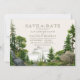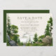 Pinheiros e aspergaminhos alinham seus detalhes de casamento, com montanhas distantes de neblina. Um cartão de salvamento para um casamento nas montanhas.