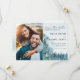 Azul poeirento rústico dos Partidos Tema salve a data em que o design apresenta montanhas de aquarela e árvores definidas sobre um fundo azul-suave. O design apresenta a sua fotografia de noivado numa proporção 5x7, e a tipografia emparelha as letras tradicionais com o texto moderno escrito à mão. #SaveTheDate #DustyBlueWedding