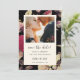 Casamento floral sangrento e romântico salve o cartão de data com um lindo padrão floral botânico de coloridas flores de olhar flores em um fundo negro. Simples salvar o script de caligrafia de data e uma foto de cheio completa este elegante salvamento do anúncio de data.