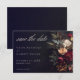 This stunning dark gothic wedding save the date card features a luxurious moody and slightly withered floral arrangement in deep jewel tones over a black background. Perfect for a mysterious and romantic fall or winter ceremony. This dramatic design is ideal for couples seeking a non-traditional, opulent or vintage style. Created by Simply Farmhouse Press.