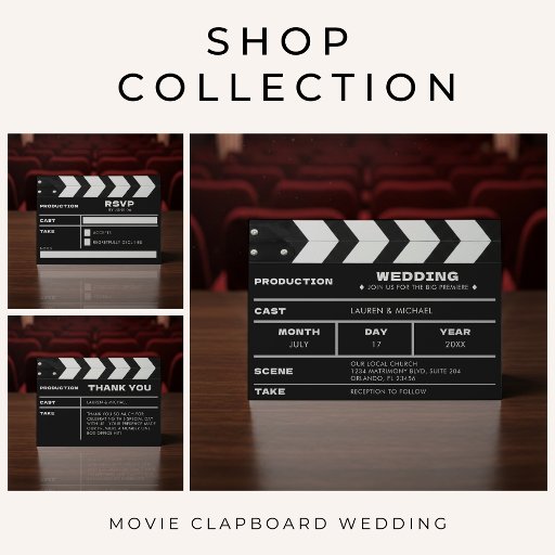 Premiere your wedding in cinematic style with this creative movie clapboard save the date card. The perfect blend of modern and retro style for couples who love classic Hollywood film and movie aesthetics. Personalize it with your event details and let your family and friends know an all star cast is about to tie the knot in style.