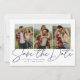 Com três fotos verticais e um roteiro moderno escrito "salve a data", este cartão é a maneira perfeita de anunciar seu noivado e o próximo casamento para amigos e familiares. O texto azul marinho chic é ousado e moderno, mas ainda sofisticado. O texto personalizável na frente tem espaço para nomes, data, local e outras informações como um site de casamento. A parte de trás é um marinho correspondente e um padrão listrado branco. A cor é editável clicando em "Personalizar".