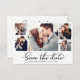 Casamento de Colagem de Fotografias Minimalista e Elegante 5 Salve os Cartões de Data, exibindo um Script de Caligrafia em moda e sofisticado em preto e branco clássico. Essa coleção é projetada especificamente para casamentos modernos, exuando um fascínio encantador e romântico. Com uma colagem de 5 fontes de grade de fotos bem arrumada e cativando a letra da cauda do swash com letras manuais, essas cartas capturam a essência da elegância contemporânea. Personalize facilmente cada cartão para refletir seu estilo único, incorporando detalhes e fotos de casamento queridos, oferecendo um meio refinado e sofisticado para anunciar e celebrar seu dia extraordinário.