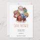 Salve o cartão de data com uma bela imagem de Natal. Um Papai Noel tradicional em sua roupa vermelha clássica. Seu cheio de presentes. Pronto para trazer presentes para todos.